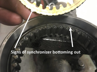 The further worn the lower it will sit in the muff. • See diagram o A synchronizer is 7.75mm (.3025) thick. o Synchronizer Muff is 10.0mm (.3936) deep from top. o A new synchronizer will have 2.25mm (.091) free wearable space under the synchronizer to wear before bottoming out. o Pick your best synchronizers. o I will not use a synchronizer that sits > .030 down in the muff. This way it will have the remaining wearable space of .061 till the synchronizer bottoms out. • To insure you have the correct synchronizer / muff match… o Mount synchronizer on gear. o Using a paint pen, mop paint on the synchronizer mating surface of the muff (this is called bluing). o Engage synchronizer into the muff, rotating and pushing down hard for a half turn. o Feel the braking action while doing this. The harder you press the tighter the braking action. This is important! o Pull apart and read how the wiping looks. If it is the correct synchronizer, the wiping will be 100% across the surface of the muff. This insures you have the correct angled synchronizer for the muff. • I purposely installed a mismatched synchronizer and muff to show what you do not want to see when you use the blue paint pen. • Tips o Put the best synchronizer on 2nd gear. o Put second best synchronizer on 3rd. o Put 3rd best synchronizer on 1st o Put 4th best synchronizer on 4th. Usually when you dismantle a transmission 4th gear synchronizer is the best because of not being used during hard shifting. This usually becomes my 2nd gear synchronizer. • Things not to do.. o Do not glass bead synchronizers to clean. This ruins them. o Do not use Scothbright to make them shinny. Sanding anything on the sharp edges of the synchronizer will wear them out.